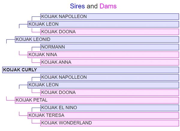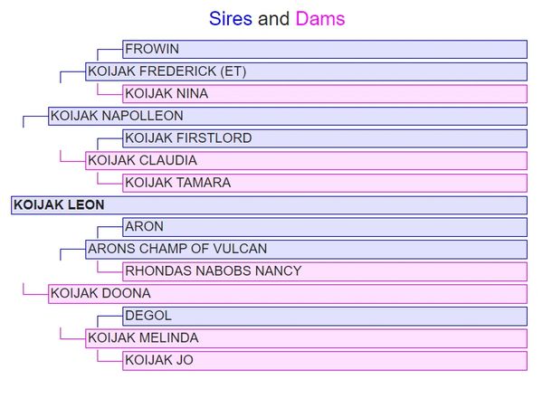 Comments: With this bull I tried some line breeding with K Leon poll on top and bottom of pedigree. This doubled up on what I worked out was the dam which had Homozygous Polled. Koijak Doona poll. Even now I have K Napolleon ps, K Leon p, K Leonid p, K Curly p, K Dr Pepper ps, K Kelso p, K Carlos p, with direct line back. Then side lines with connections to K Napolleon p/ K leon p being K Ewan et p, K Codebreaker p, and K Blackstone also carrying K Napolleon. All these bulls are still in the tank as well, although Napolleon has only 2 doses left. Sire of Napolleon is K Frederick et horn, and his sire is Frowin (swiss fullblood) which is still in tank too. Much to do yet.